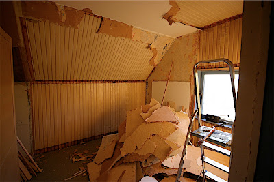 Riving av platene på veggene tar tid og det søpler. Dette blir et fint tilhengerlass! Under papplatene viser fin panel seg. Panelet er kanskje enda bedre på dette rommet enn de andre rommene der vi har funnet den frem igjen.