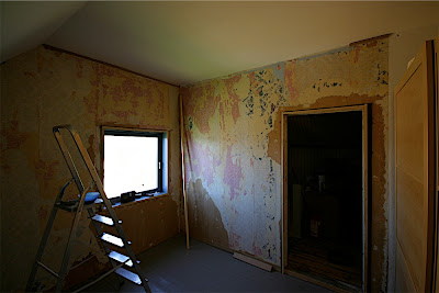 På det som en gang var soverommet, og det første rommet som vi pusset opp, har vi igjen kastet oss over oppussingsjobben. Da vi overtok huset var vi uerfarne og torde ikke å rive av nok på veggene. Det har vi fått erfare gjennom hele vinteren. Platene som har vært på veggen lukter og støver. Utgangspunktet var fint, men rommet var potte tett.